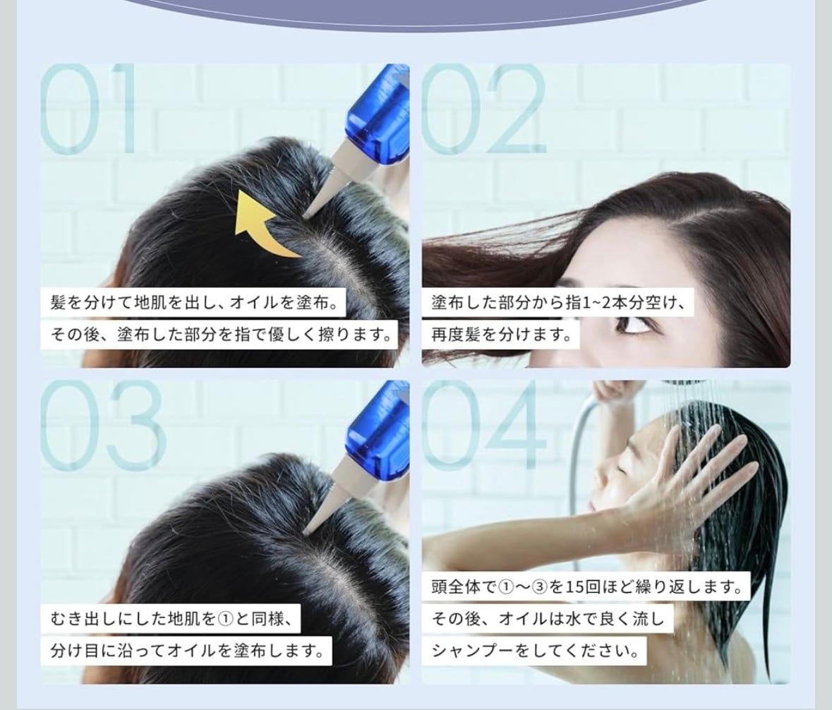 【使い方】 乾いた頭皮にノズルの先をダイレクトにつけ、オイルをなじませます。 (頭皮を濡らしてしまうと洗浄力が落ちてしまいますで必ず乾いた頭皮にお使い下さい)